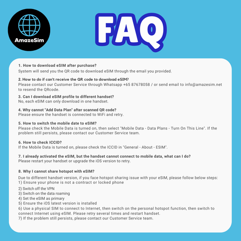 Due to eSIM is a new technology, certain handsets may face problems with hotspot sharing using eSIM. If you have difficulties on hotspot sharing, please refer to FAQ. If the problem persists, please contact our Customer Service team.