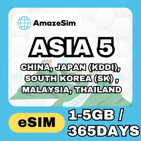 AmazeSim ASIA 5 eSIM 365 Days High speed 5G data 1-5 GB | 24H Email Delivery